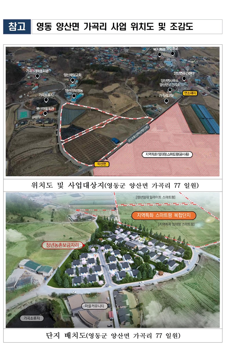 이번 공모는 전국 4개 시‧군을 선정하는 사업으로, 영동군은 양산면 가곡리 일원에 국비 50억원과 군비 50억원 등 총 100억원의 예산을 투입해 청년층의 농촌 정착 지원과 주거 여건 개선을 도모한다.
