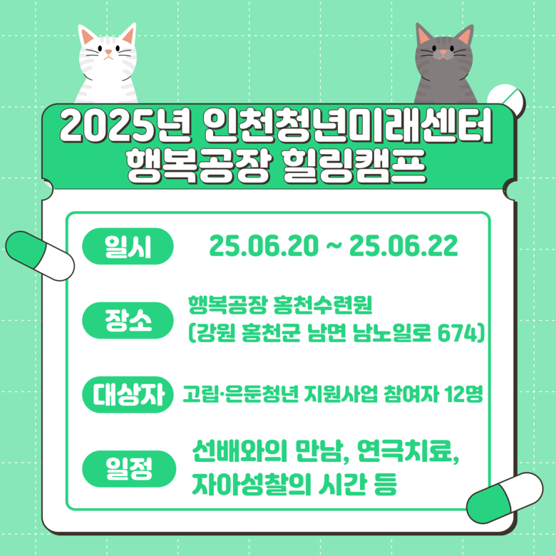 임문진 인천시청년미래센터장은 “고립은둔청년은 자신의 상처를 회복하는 시간을, 고립은둔청년과 함께 사는 가족은 마음을 다독이고 힘들어하는 가족을 이해하는 기회가 될 것으로 기대한다”며 “고립은둔청년과 가족 모두 마음의 힘을 얻어가기를 바란다”고 말했다.