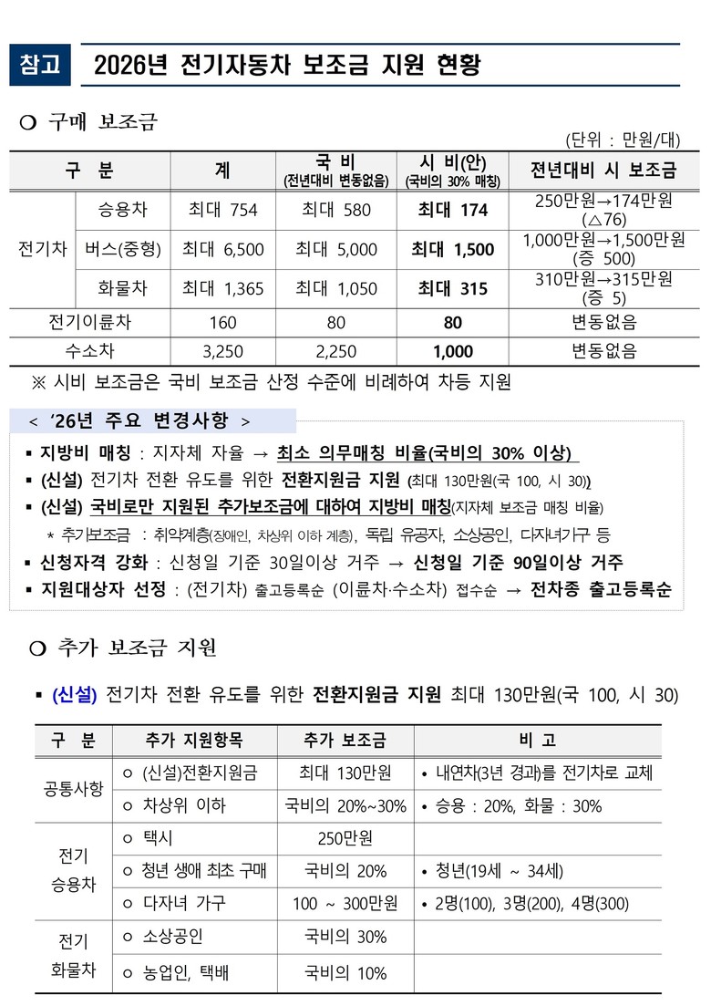 친환경차 구매 보조금은 정부 지침에 따라 차종별로 차등 지원된다. 전기차의 경우 ▲승용차 최대 754만 원 ▲화물차 최대 1,365만 원 ▲버스(중형) 최대 6,500만 원까지 지원되며, 수소차는 승용차 기준 정액 3,250만 원을 지원받는다.
