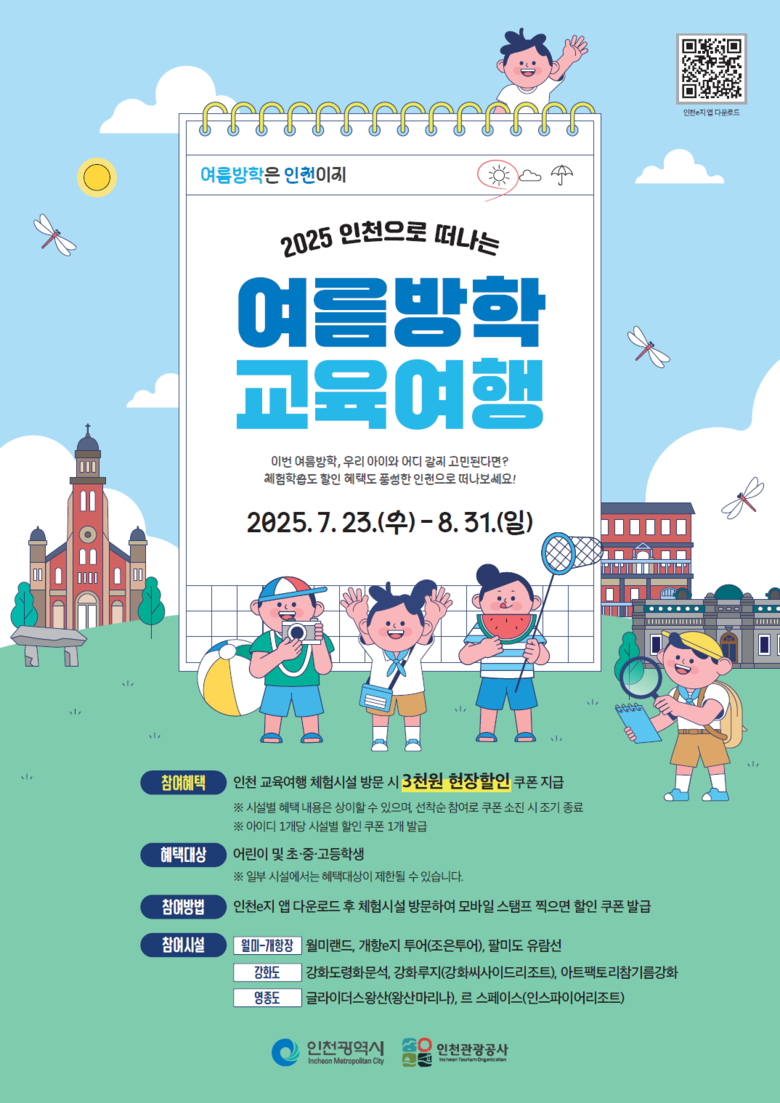 [인천 세계타임즈=심하린 기자] 인천광역시(시장 유정복)와 인천관광공사(사장 백현)는 여름방학을 맞아 7월 23일부터 8월 31일까지 청소년을 대상으로 ‘2025 인천으로 떠나는 여름방학 교육여행’ 이벤트를 진행한다고 밝혔다.