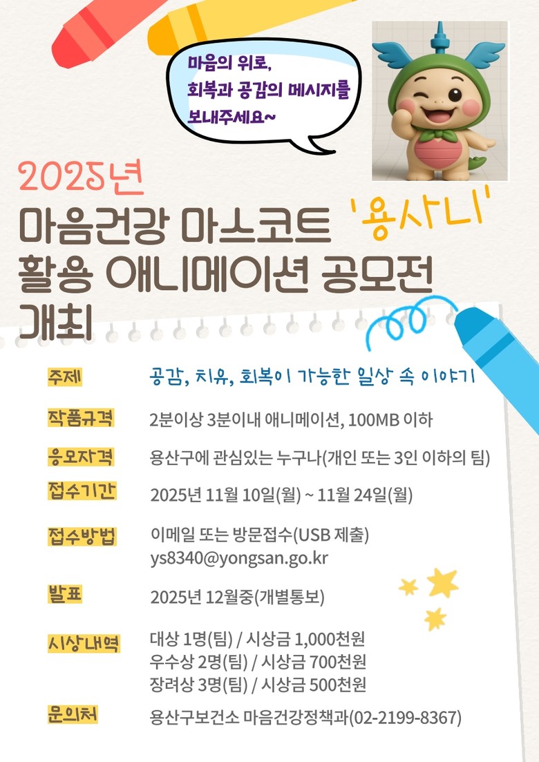 공모 주제는 ‘공감, 치유, 회복이 가능한 일상 속 이야기’로, 작품 형식은 2분 이상 3분 이내의 애니메이션(100MB 이하)이어야 한다. 용산구에 관심 있는 누구나 개인 또는 단체 단위로 참여할 수 있다.