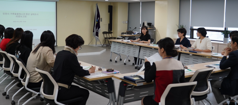 | ▲ (사진 가운데)최혜정 인천시사회서비스원 정책연구실 부연구위원이 지난달 말 ‘인천시 가족돌봄청소년·청년 실태조사’ 연구 최종보고를 하고 있다. |