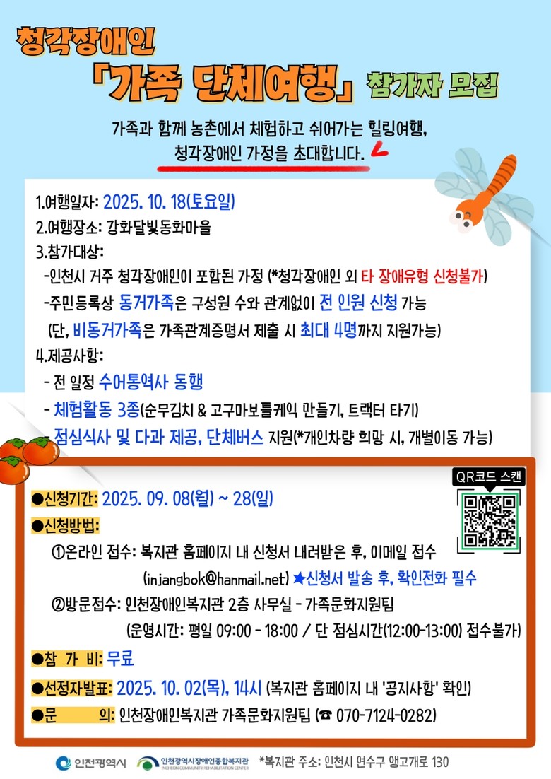 9월28일까지 10가정 모집 [인천 세계타임즈=심하린 기자] 인천시사회서비스원 소속 인천장애인종합복지관은 청각장애인 가족 단체여행 참가자를 모집한다고 17일 밝혔다.