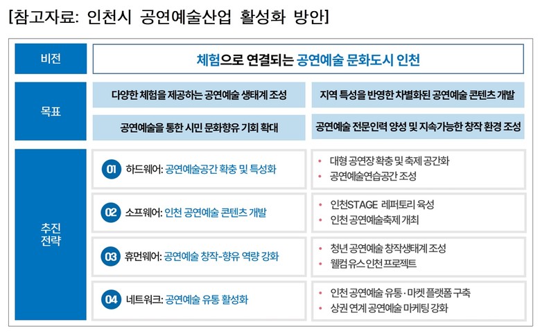 이에 본 연구는 “체험으로 연결되는 공연예술 문화도시 인천”이라는 비전 아래, 하드웨어, 소프트웨어, 휴먼웨어, 네트워크 부문의 4대 추진전략을 제안했다.