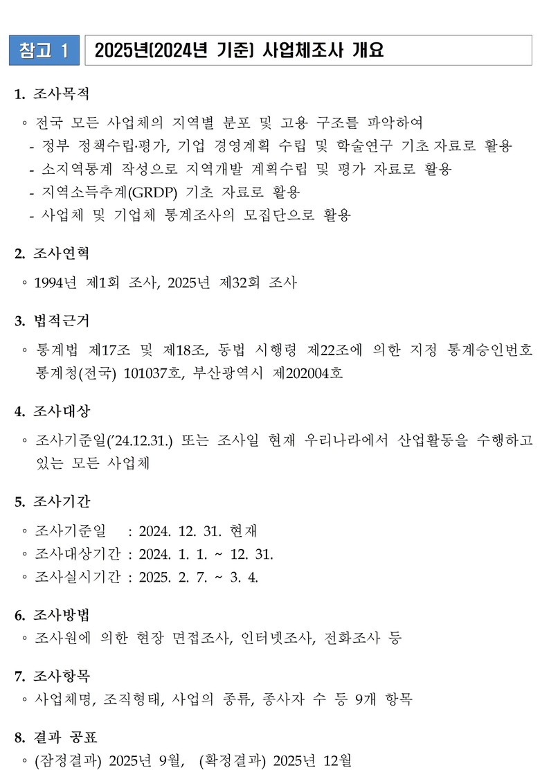- (조사대상) 조사기준일(’24.12.31.) 또는 조사일 현재 부산에서 산업활동을 수행하고 있는