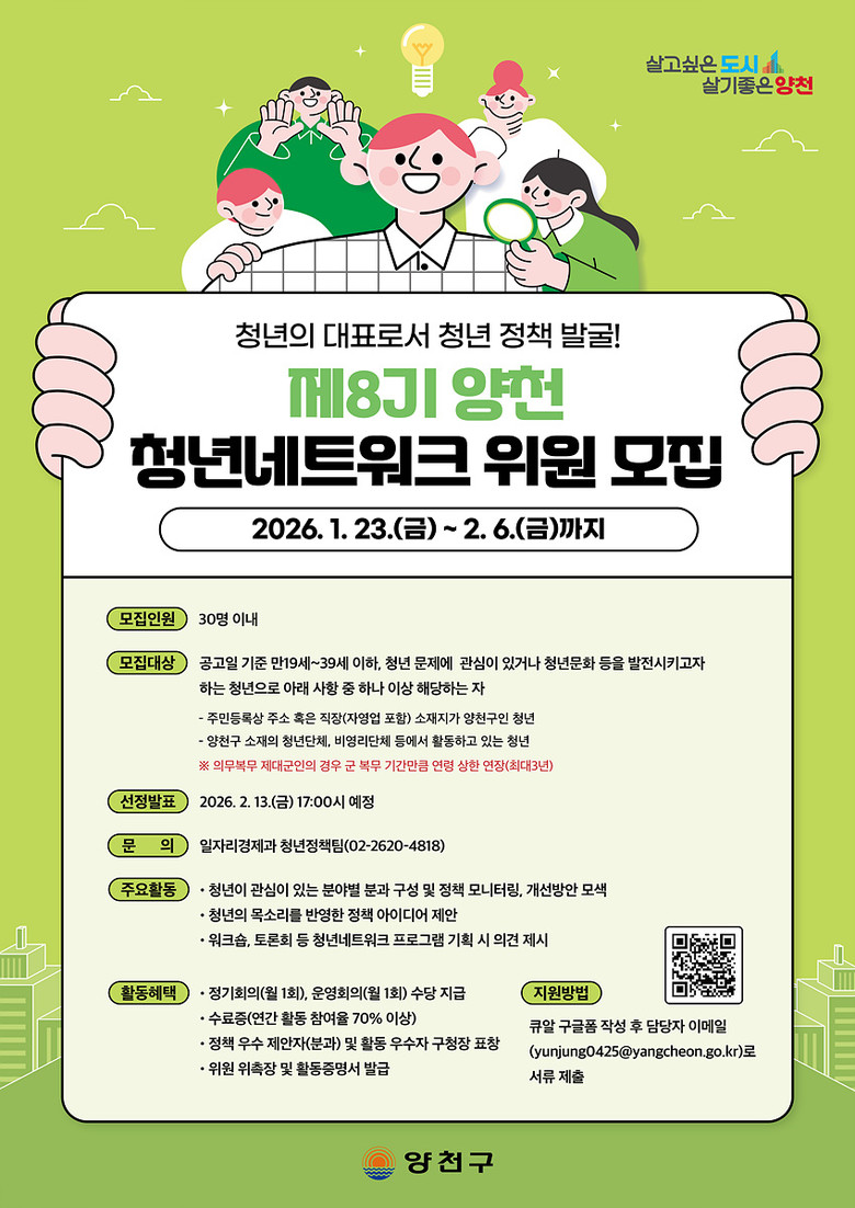 – 문화·예술, 복지·평등, 일자리·창업, 주거 등 4개 분과운영...우수 참여자 구청장 표창 수여 [양천구 세계타임즈=이장성 기자] 양천구(구청장 이기재)는 청년이 직접 정책을 발굴하고 실행방안을 제안하는 청년 중심 소통 플랫폼 ‘제8기 양천 청년네트워크’ 위원을 2월 6일까지 모집한다고 밝혔다.