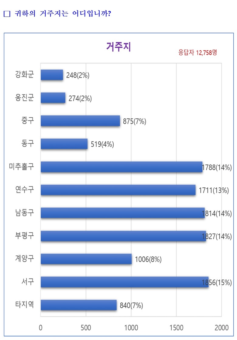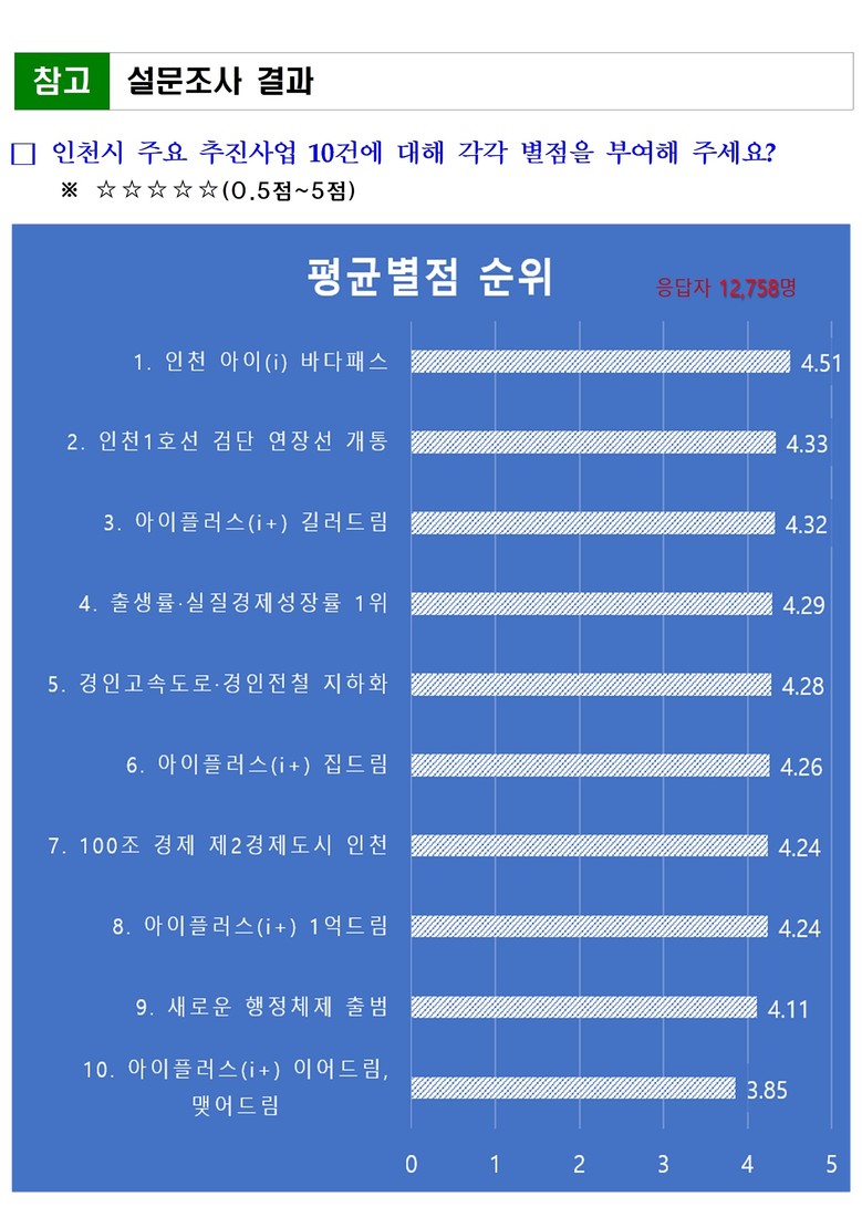 설문조사는 인천시가 추진한 10대 주요 사업을 대상으로 각 사업에 대해 5점 만점의 별점 평가 방식으로 진행됐다. 전반적으로 시민들은 인천시의 주요 정책들에 높은 점수를 부여했으며 특히 교통정책 분야를 최우선으로 평가했다. 또한, 아이플러스(i+) 길러드림, 아이플러스(i+) 집드림(천원주택) 등 인천형 출생 정책에도 높은 기대감을 나타냈다.