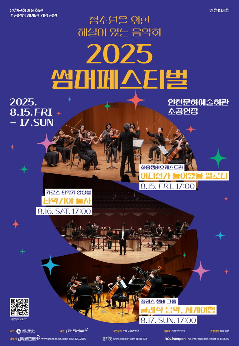 인천시 문화예술회관의 여름방학 시즌 청소년음악회에 대한 자세한 사항은 문화예술회관 누리집을 참조하면 된다. 초등학생 이상 관람가.