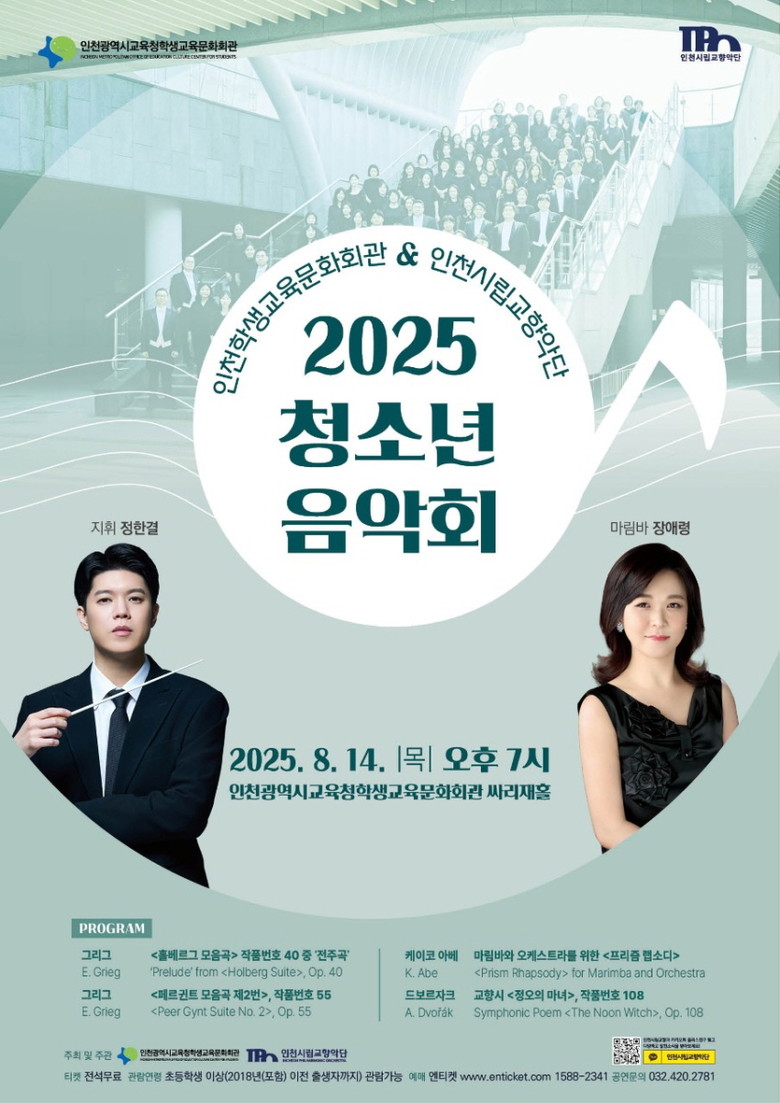 인천시립교향악단은 인천시학생교육문화회관과 손잡고 <2025 청소년음악회>를 개최한다. 정한결 인천시향 부지휘자가 지휘와 해설을 맡았으며, 그리그의 <페르귄트 모음곡 제2번>, 드보르자크의 교향시 <정오의 마녀> 등 청소년의 감수성과 상상력을 자극하는 스토리텔링 중심의 곡들을 소개한다. 또한 마림비스트 장애령이 협연자로 나서, 일본의 작곡가이자 마림바 연주의 선구자인 케이코 아베의 대표 협주곡 <프리즘 랩소디>를 연주해 청중들에게 특별한 청각적 경험을 선사할 것이다. 8월 14일 오후 7시에 인천학생교육문화회관 싸리재홀에서 열리는 이 공연은 전석 무료이며, 엔티켓에서 1인 4매까지 예매 가능하다.