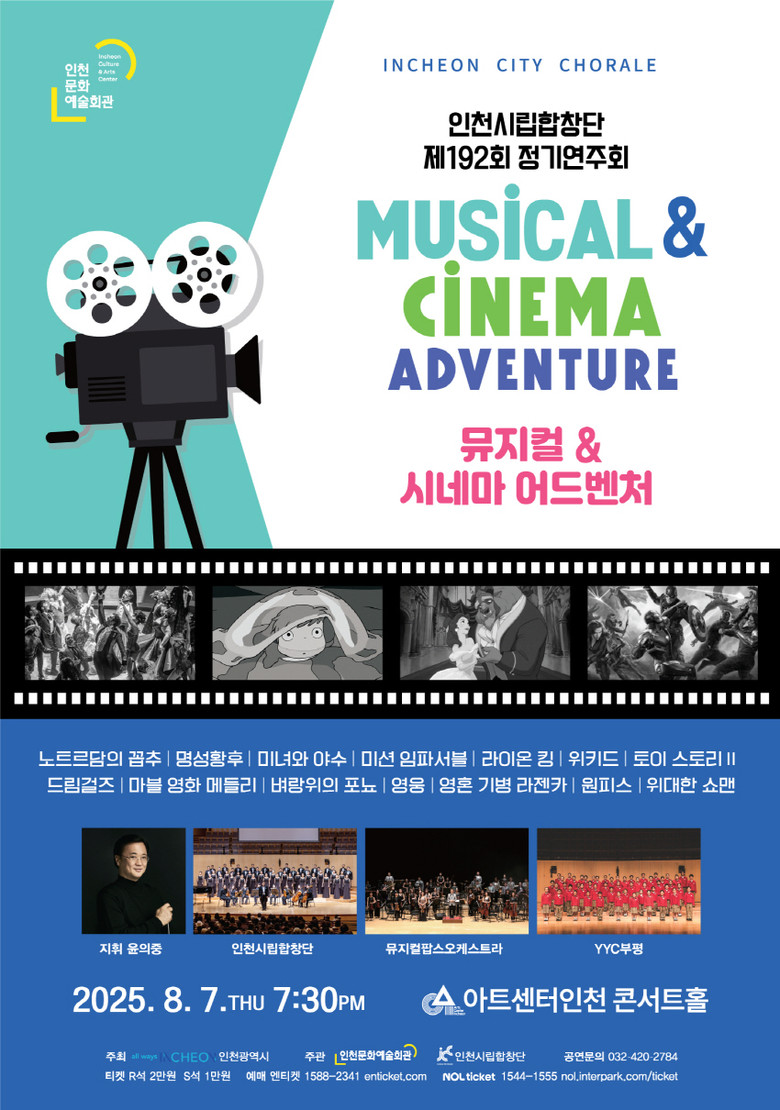 인천시립합창단은 뮤지컬과 영화 음악을 한자리에서 즐길 수 있는 짜릿한 <뮤지컬 & 시네마 어드벤처>를 마련한다. 에너지 넘치는 오케스트라 사운드가 돋보이는 <미션 임파서블> 주제곡과 마블 스튜디오 영화 메들리, 애니메이션의 명가(名家) 스튜디오 지브리와 디즈니의 삽입 음악(OST), 뮤지컬 <위키드>, <명성황후> 등 시대를 아우르는 명곡들을 풍성한 합창으로 들려주며, 여름밤의 꿈같은 시간을 약속한다. 8월 7일 아트센터인천 콘서트홀에서 R석 2만 원, S석 1만 원에 관람할 수 있다.