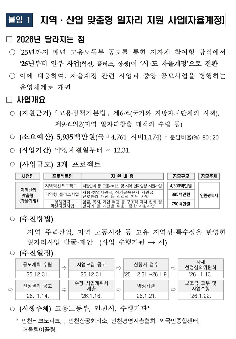 인천시는 뿌리산업과 자동차 부품제조업을 기반으로 한 ▲지역혁신 프로젝트 ▲지역형 플러스 일자리사업 ▲업종별 상생협약 확산 지원사업 등 총 3개 사업에 국비 47억 원과 시비 12억 원을 포함한 총 59억 원 규모의 재원을 투입한다.
