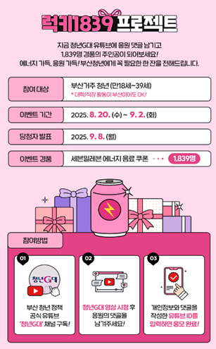 일반 이벤트 <럭키1839 프로젝트>는 유튜브 채널을 구독하고 응원 댓글을 남긴 청년 중 1,839명을 추첨해 에너지 음료 쿠폰을 제공하는 행사다.