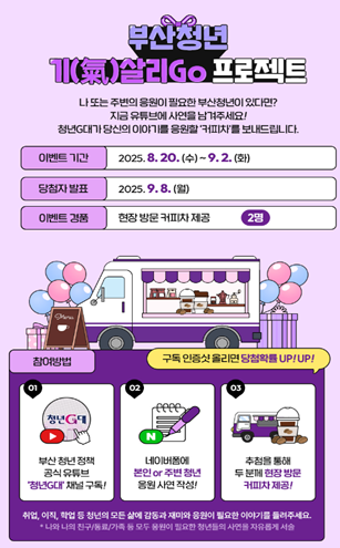 특별 이벤트 <부산청년 기(氣)살리고(Go) 프로젝트>는 청년의 취업·이직·도전·실패 등 다양한 경험담을 공모하고, 2명을 선정해 소속 기관 또는 학교에 응원 커피차를 제공하는 행사다. 선정된 청년의 이야기는 영상으로 제작하여 유튜브 채널을 통해 더 많은 청년과 공유할 예정이다.