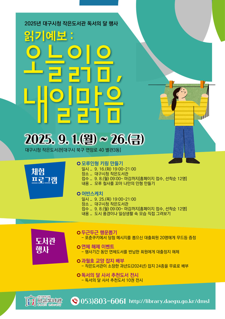 ▸ 과월호 잡지 나눔 등 다양한 이벤트 및 체험 프로그램 진행 [대구 세계타임즈=한윤석 기자] 대구광역시청 작은도서관은 9월 ‘독서의 달’을 맞아, 9월 1일부터 26일까지 4주간 ‘읽기예보: 오늘읽음, 내일맑음’이라는 주제로 시민을 위한 다양한 독서문화 행사를 운영한다.