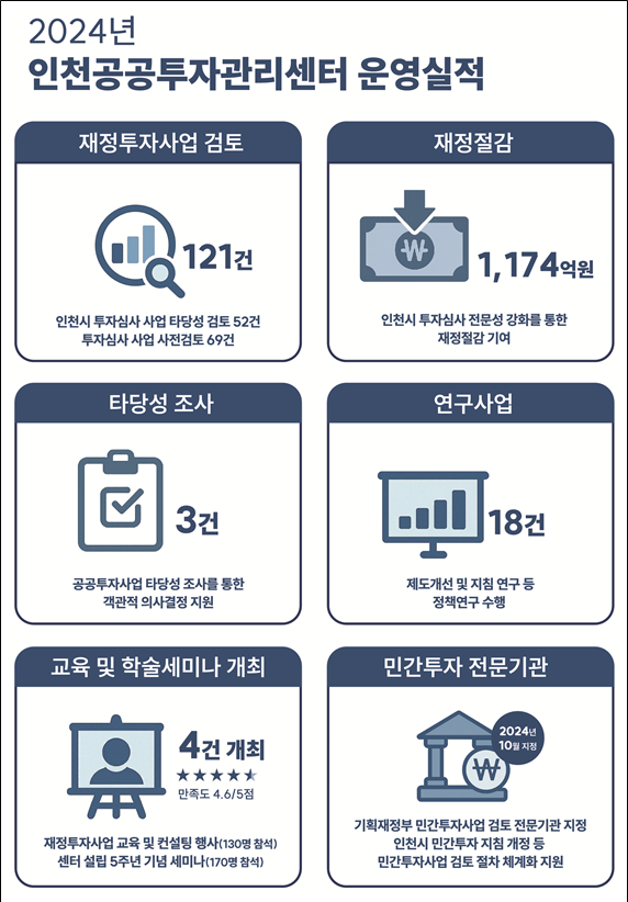 인천시는 지방재정의 건전성과 효율성을 높이기 위해 2019년 「인천광역시 공공투자사업 관리에 관한 조례」를 제정하고, 이듬해인 2020년 인천연구원 내에 센터를 설립하였다. 올해 설립 5주년을 맞은 센터는 재정 및 민간투자사업 검토, 타당성 조사, 정책연구, 교육 및 컨설팅 등의 업무를 수행하고 있다.