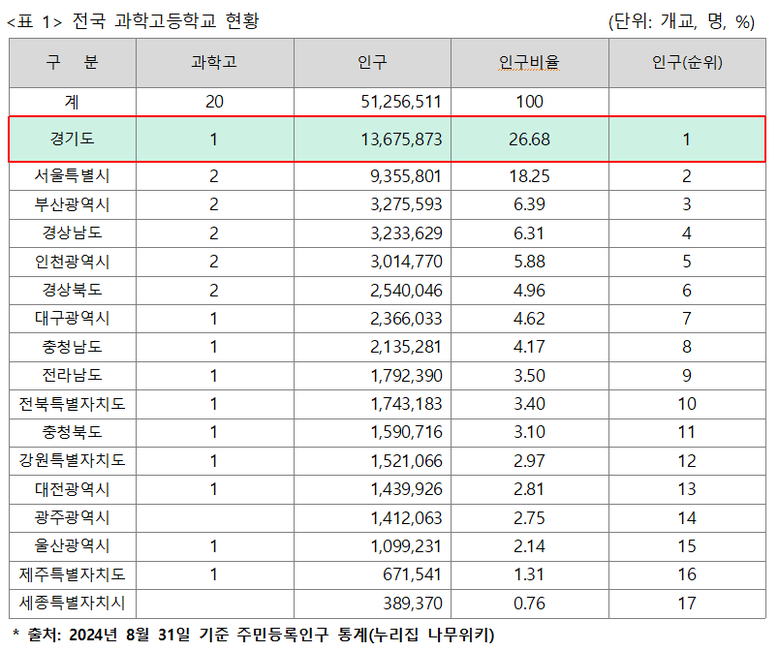 과학고는 위 표 1과 같이 전국에 20개교가 있다. 그러나 전체 인구의 1,367만 명이나 되는(전체 인구의 26.68%) 경기도에는 과학고가 경기북과학고등학교 1개교뿐이다. 그렇다면 다른 광역자치단체와의 형평성 및 거주민들의 수요에 따라 경기도에는 최소 2개교 이상의 과학고등학교가 있어야 하고, 추가로 과학고가 들어선다면 경기북부권에 이미 경기북과학고등학교가 있는 만큼 지역적 형평성(경기남부권 인구가 1,009만 명으로 전체 경기도 인구 1,367만 명의 73.8%)과 지역사회 발전 속도 등을 감안 경기동남부에 들어서는 것이 공평하다고 생각된다.