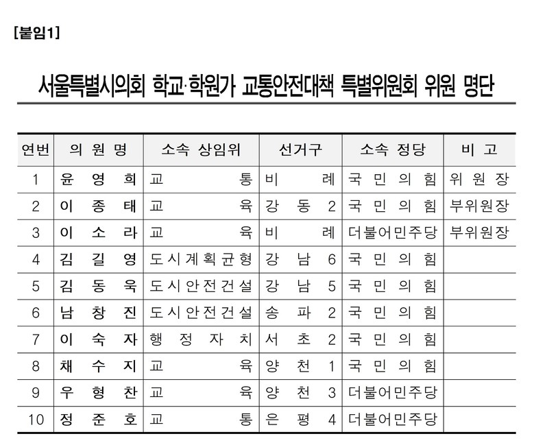 이종태 부위원장(국민의힘, 강동2)은 “이번 특별위원회 활동을 통해 서울시 학교 및 학원 밀집 지역에 대한 전반적인 교통안전이 증진될 수 있는 새로운 제도가 모색되기를 희망한다”고 말했다.