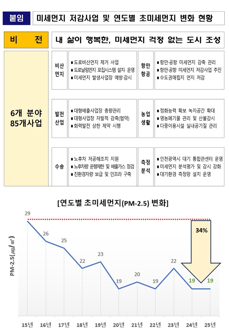 정승환 시 환경국장은“「인천광역시 제2차 미세먼지 관리 시행계획(2025~2029)」을 통해 5년간 1조 5,290억 원을 투자해 2029년까지 초미세먼지(PM-2.5) 연평균 농도 15㎍/㎥ 달성을 목표로 하고 있다”며, 미세먼지 걱정없는 도시를 만들기 위해 최선의 노력을 다할 것”이라고 밝혔다.