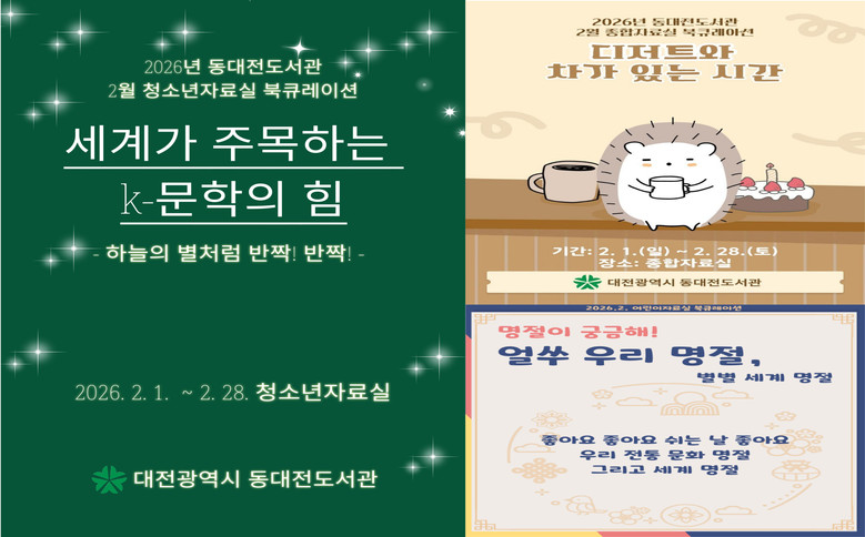어린이자료실에서는 ‘얼쑤 우리 명절, 별별 세계 명절’을 주제로 우리나라 전통 명절과 세계 각국의 다양한 명절 문화를 소개하는 도서 10권을 전시하며, ‘이달의 작가’ 코너에서는 세계적인 그림책 작가 에릭 칼(Eric Carle)의 작품 10권과 책 속 캐릭터 인형을 만나볼 수 있다.