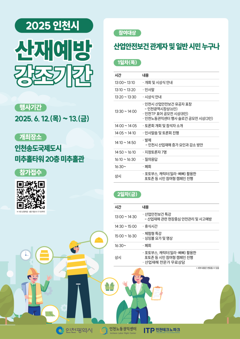 - 산업현장 안전 강조 … 생산성과 경쟁력 제고 효과 기대 - [인천 세계타임즈=심하린 기자] 인천광역시(시장 유정복)는 산업재해 예방의 중요성을 알리고 안전문화를 확산하기 위해 ‘2025 인천시 산재예방 강조기간’ 행사를 오는 6월 12일과 13일 양일간 송도국제도시 미추홀타워 20층 미추홀관에서 개최한다고 밝혔다.