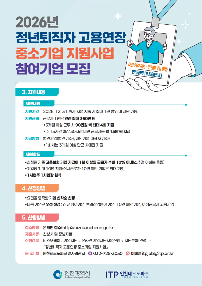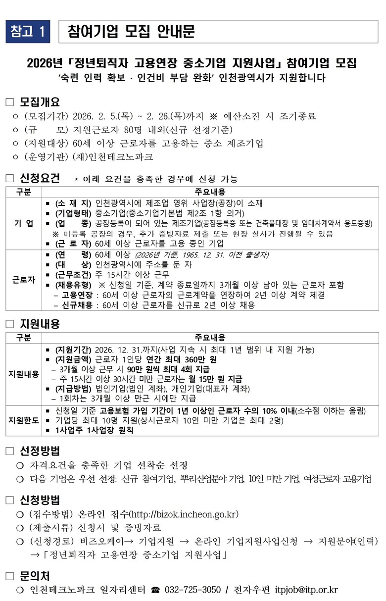 인천시는 2월 5일부터 2월 26일까지「2026년 정년퇴직자 고용연장 중소기업 지원사업」에 참여할 중소 제조기업을 모집한다고 밝혔다.