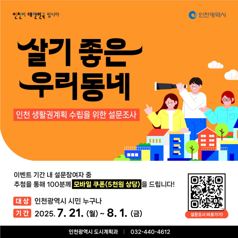 강유정 도시계획과장은 “이번 설문조사를 통해 시민이 체감하는 생활환경의 현황과 수요를 직접 반영함으로써, 보다 실효성 있는 생활권 단위 도시계획을 수립하는 데 큰 기초자료가 될 것”이라며 “많은 시민의 참여가 인천의 더 나은 미래를 함께 만들어가는 밑거름이 되길 바란다”고 전했다.