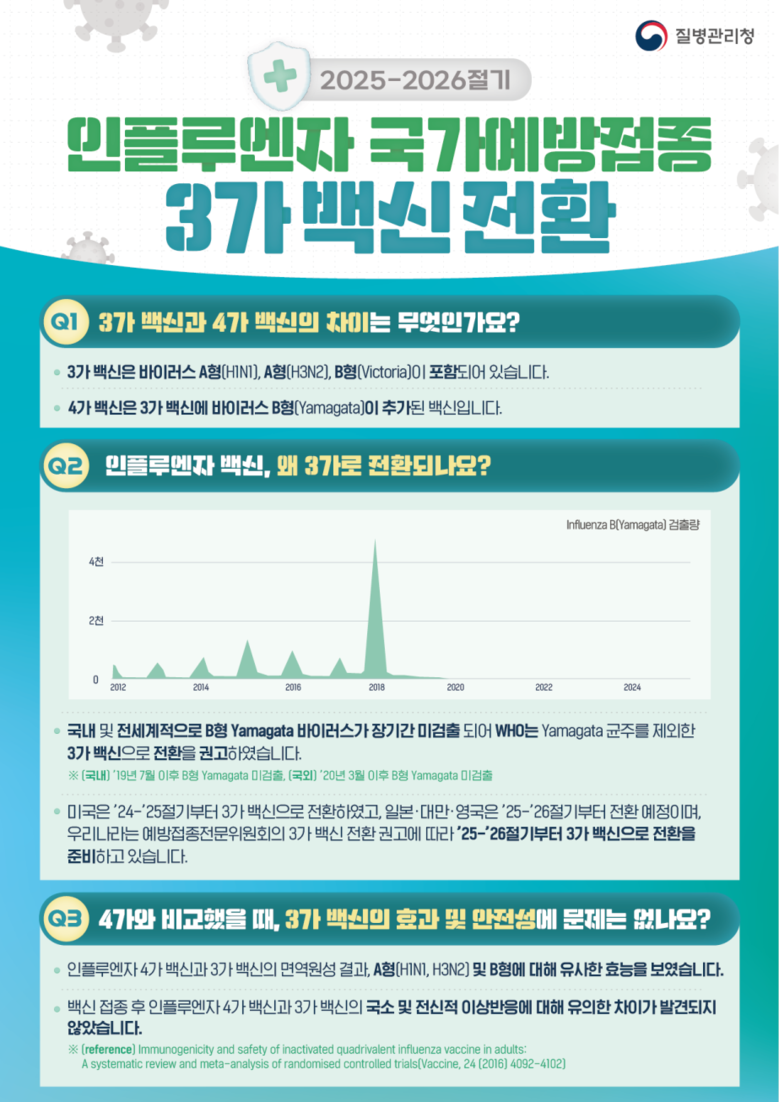 2025~2026절기부터 인플루엔자 백신은 세계보건기구(WHO)의 권고사항과 예방접종전문위원회 심의에 따라 기존 4가 백신에서 3가 백신으로 전환하여 시행*된다.