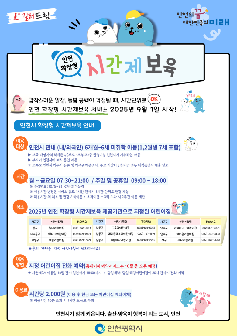 한편, 이번 ‘아이플러스(i+) 길러드림’ 확장형 시간제 보육은 인천시가 추진하는 저출생 극복을 위한 ‘아이플러스(i+) 출생정책 6종(이어드림, 맺어드림, 1억드림, 집드림, 차비드림, 길러드림) 시리즈’중 하나로, 생애주기별 맞춤형 지원을 통해 아이 낳고 키우기 좋은 도시 조성에 기여할 것으로 기대된다.