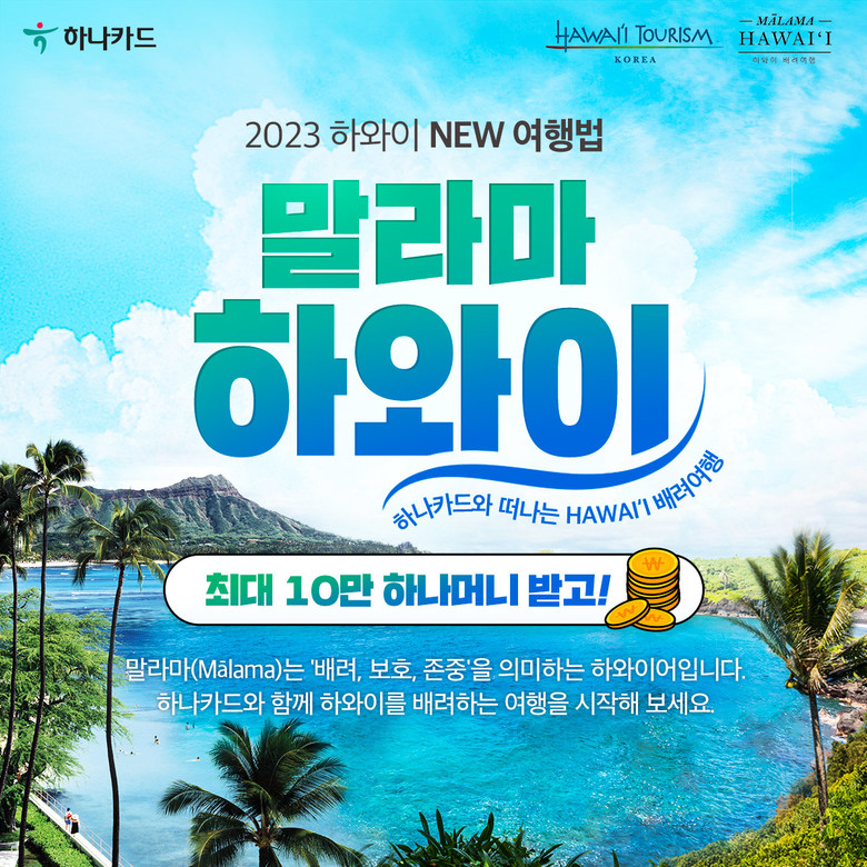 이번 이벤트는 하나금융그룹의 ESG경영 실천의 일환으로 하와이 관광청에서 진행하는 ‘말라마 하와이 (Mālama Hawai‘i, 하와이 배려 여행)’ 캠페인과 함께한다. ‘말라마’는 하와이어로 ‘배려’, 영어로는 ‘care for’라는 의미로 말라마 하와이는 ‘하와이 배려여행’으로 해석한다. 나만의 나무 심고 기부하기, 바다 생물과 자연스럽게 만나는 ‘만타레이 스노클링’, 비치 클린업 활동이 포함된 ‘선셋 요가’, 외래종을 제거하며 하와이 토착 식물에 대해 배우는 ‘숲 트래킹’, 와이키키 역사를 주제로 한 ‘워킹 투어’ 등의 활동을 통해 여행 이상의 가치를 느낄 수 있을 것으로 기대된다.