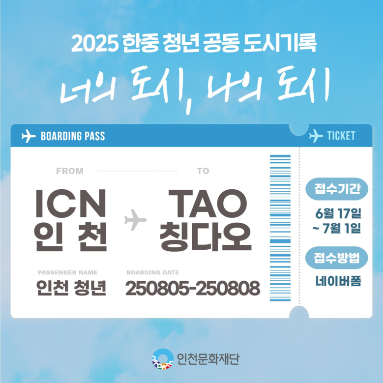 ○ 청년들의 3박 4일 공동 프로젝트, 6월 17일부터 7월 1일까지 접수 [인천 세계타임즈=심하린 기자] 한중 청년 공동도시기록 <너의 도시, 나의 도시>가 2025년 8월 5일(화)부터 8월 8일(금)까지 3박 4일간 중국 칭다오에서 개최된다. 본 사업은 1995년부터 이어진 인천과 칭다오의 우호도시 30주년을 기념하여 기획된 국제 문화교류 프로그램이다. 인천문화재단은 문화예술 매개의 청년 교류로 도시와 사람, 예술을 연결하는 새로운 교류 협력 모델을 제시하고자 한다.