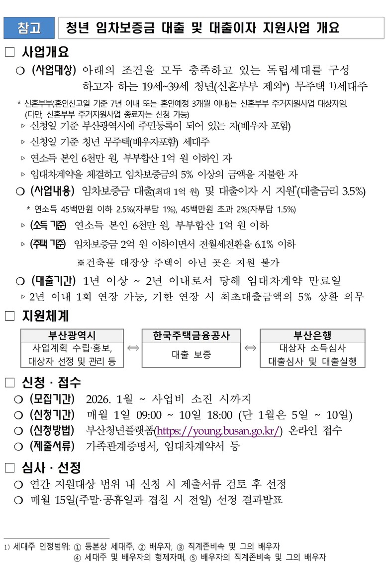 ▲시는 대출금리 연 2~2.5퍼센트(%)를, 1년에 최대 250만 원까지 2년간(연장 시 최대 4년) 지원하고, ▲한국주택금융공사는 대출금 100퍼센트(%)를 보증하며 ▲부산은행은 최대 1억 원까지 임차보증금 대출을 실행한다.