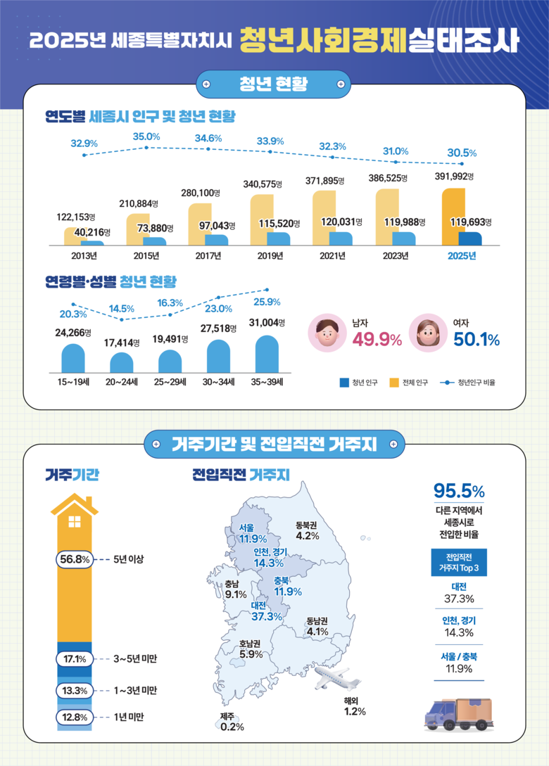 해당 조사 기간인 올해 4월 기준 행정안전부 주민등록인구통계상 세종시 총인구 39만 1,992명 중 청년(15~39세)은 11만 9,693명으로 총인구의 30.5%다.