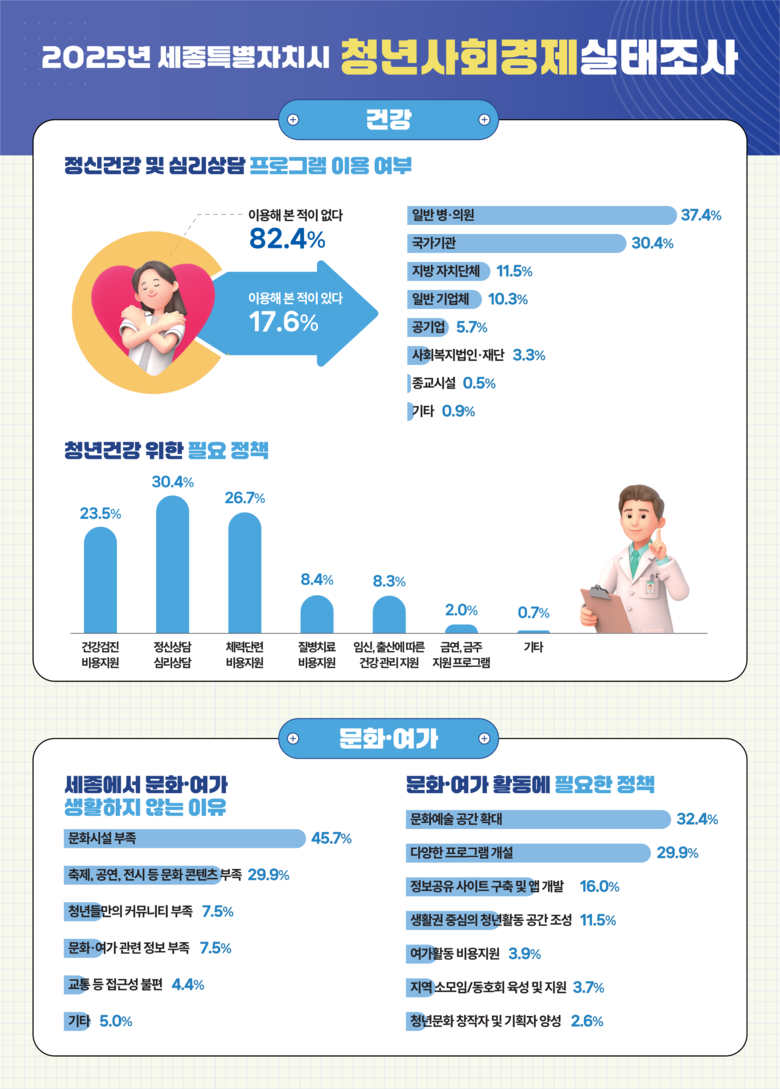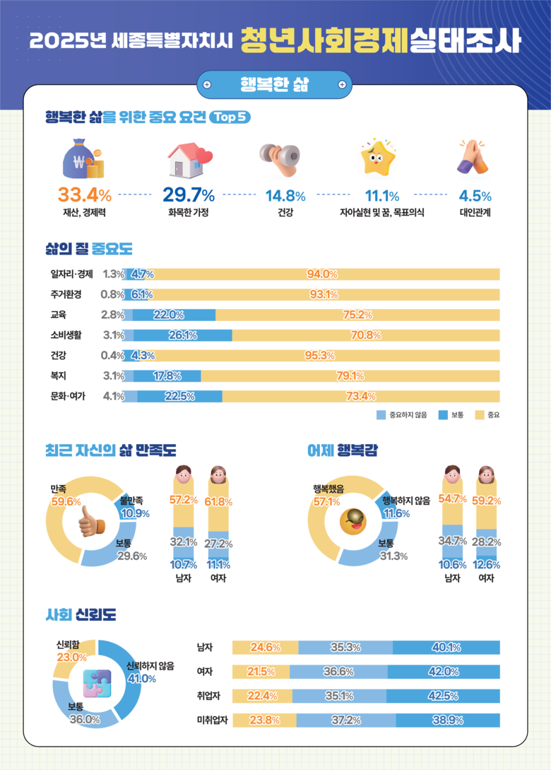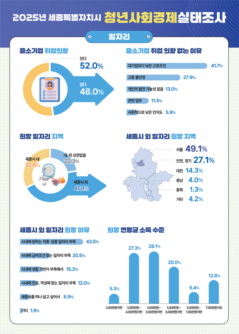 이번 2025년 세종시 청년사회경제실태조사와 관련된 자세한 내용은 세종통계포털(www.sejong.go.kr/stat) 내 ‘통계간행물-청년사회경제실태조사’ 게시판에서 확인할 수 있다.