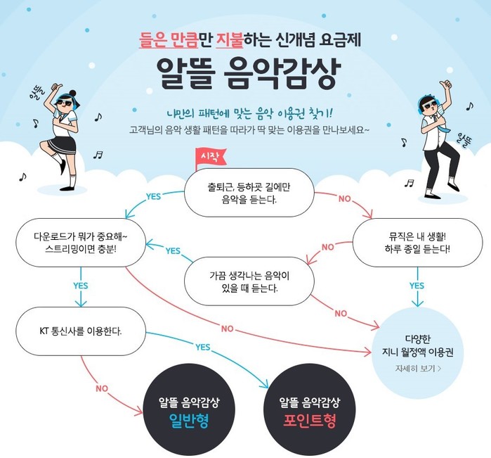 지니의 알뜰음악감상 상품은 이용자가스트리밍으로 음악을 감상한 만큼 요금이 집계되는 종량형 상품으로 라이트 유저들에게 유리하다.이용자들은 기본료 100원만 내면 1곡당 15원으로 지니에서음원스트리밍 서비스를 이용할 수 있다.이 상품은 지난 2015년 9월 국내 최초로 출시돼 꾸준히 이용자들의 호응을 받아왔다.