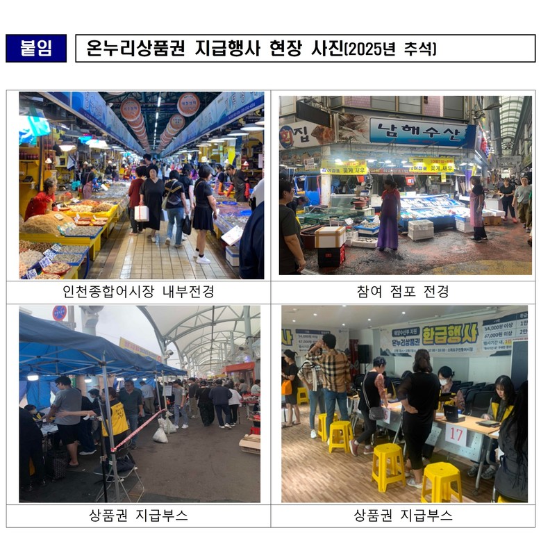 인천시는 올해 총 5회에 걸쳐 같은 행사를 추진하며 18만 3천여 명 시민에게 약 30억 8천만 원의 온누리상품권을 환급한 바 있다. 이번 행사에서도 8억 1천만 원 상당의 온누리상품권이 선착순 지급되며, 예산 소진 시 조기 종료될 수 있다.
