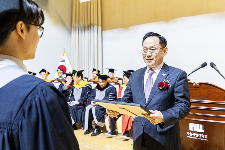 이날 서울시립대학교 대강당에서 열린 학위수여식에는 대학 및 대학원 석·박사 졸업생과 학부모 등을 포함한 약 1,000여 명이 참석한 가운데 진행됐다.