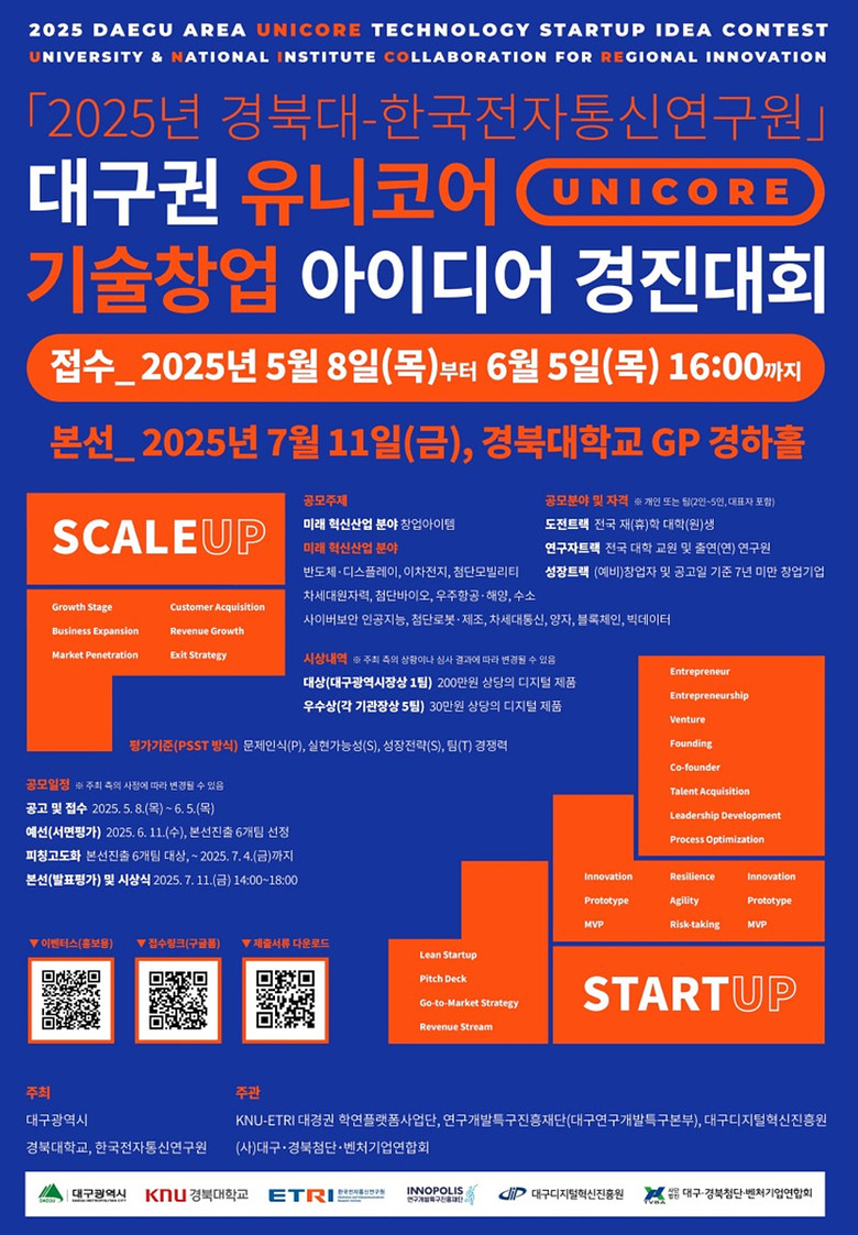 ▸ 실질적인 창업성과 유도, 전문가 멘토링 및 후속 지원까지 풍성 [대구 세계타임즈=한윤석 기자] 대구광역시는 오는 7월 11일(금), 경북대학교 글로벌플라자(경하홀)에서 경북대학교, 한국전자통신연구원(ETRI)과 함께 ‘2025년 대구권 유니코어* 기술창업 아이디어 경진대회’를 개최한다.