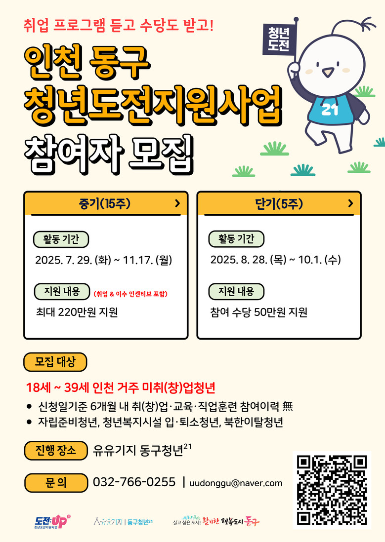 계속된 취업 실패·학업 중단 등으로 구직을 단념하거나 어려움을 겪고 있는 18세~39세의 청년이라면 유유기지 동구청년21 누리집의 청년도전지원사업 게시판 또는 고용24 누리집에서 누구나 신청 가능하다. 자세한 문의는 동구 청년도전지원사업팀(032-766-0255)으로 하면 된다.