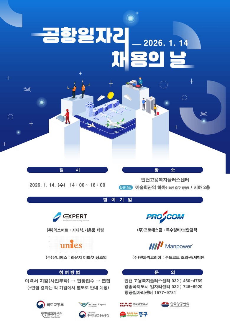 이번 ‘공항일자리 채용의 날’은 항공산업 분야 일자리 확대와 관련 기업의 인력수급 문제 해결을 위해 마련된 행사로, 인천 중구와 중부지방고용노동청, 항공일자리센터가 협업해 운영한다.