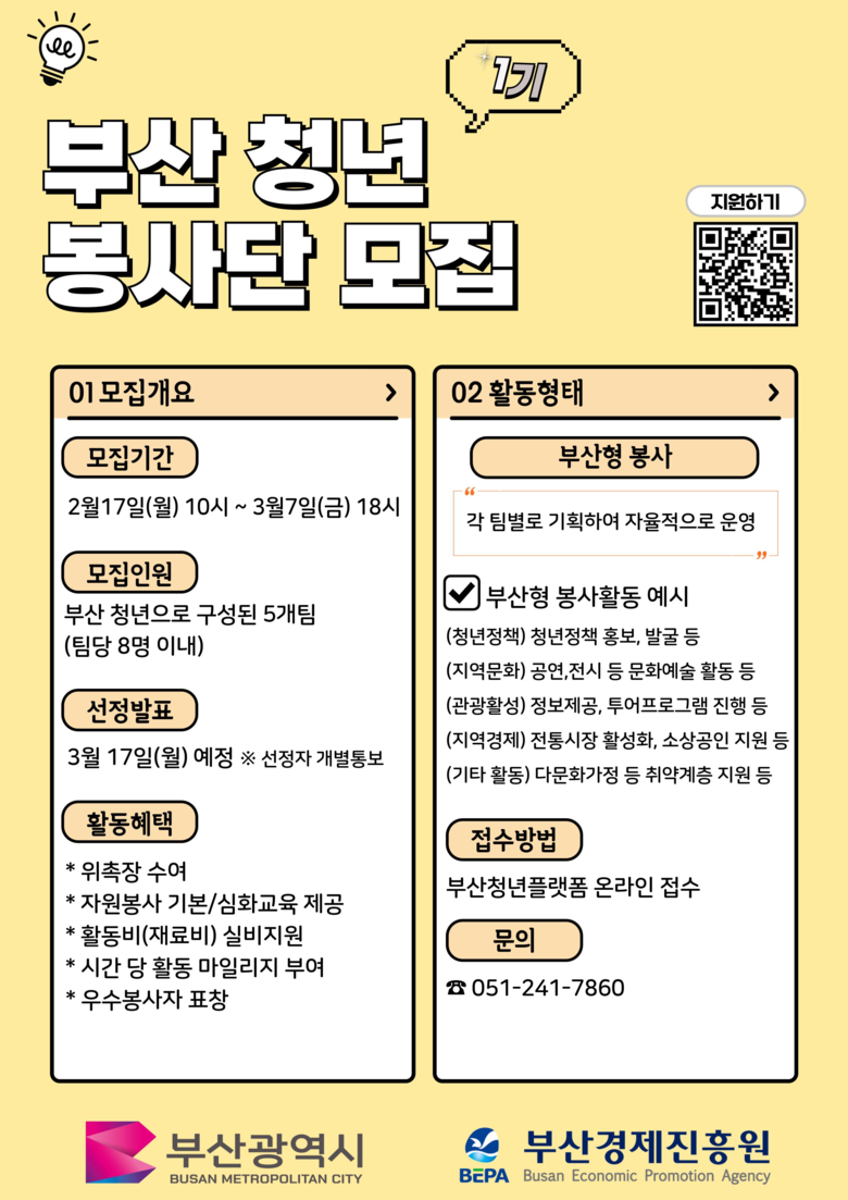 봉사단에 참가하고자 하는 청년(팀)은 오늘(17일)부터 3월 7일까지 부산청년플랫폼(young.busan.go.kr)을 통해 신청하면 된다.
