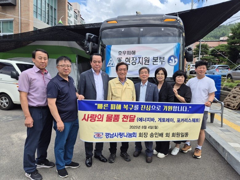 [세계타임즈]최성룡기자 = 경남사랑나눔회(회장 송인배)는 지난 7월 중순경 집중호우로 특별재난지역으로 지정된 산청군 수해 복구를 위해 자원봉사활동에 이어 8월 4일 오후 2시 석영웅 사무국장의 진행으로 정길모 수석부회장, 김종식 부회장, 송선옥 회원, 박영숙 회원, 강권석 재무국장이 참석하여 구호물품을 전달했다.