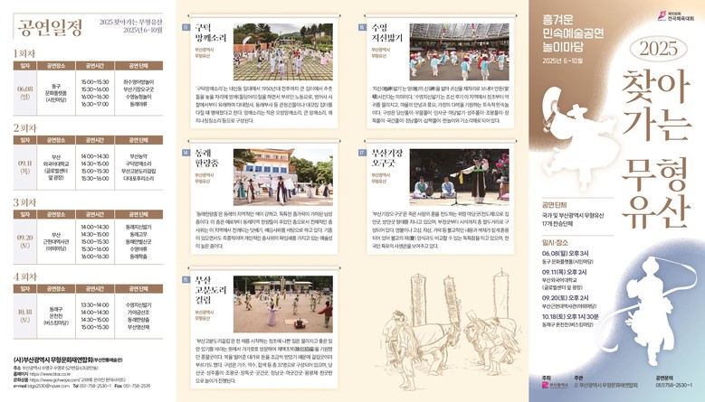 공연은 부산 전역에서 6월에서 10월 중 총 4회 열릴 예정이며, ▲동래야류 ▲부산농악 ▲수영농청놀이 등 국가 및 시 무형유산 17개 종목*의 전수자들이 참여한다.