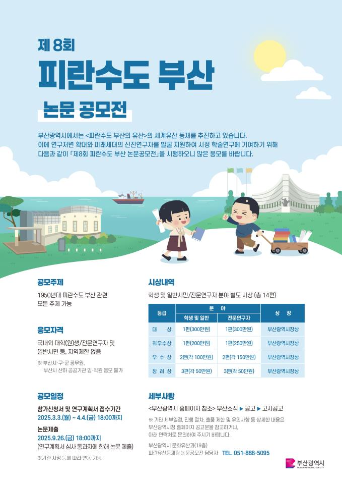 한편, 공모전과 관련한 자세한 사항은 시 누리집 고시공고(www.busan.go.kr/nbgosi) 또는 피란수도 부산유산 누리집(www.busan.go.kr/wartime_capital)을 참고하거나 시 문화유산과(☎ 051-888-5095)로 문의하면 된다.