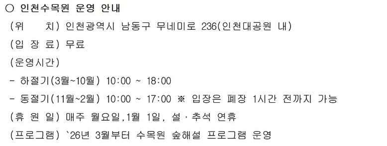 한편, 인천수목원의 봄은 절기상 ‘우수(雨水)’인 2월 중순부터 본격적으로 시작된다. 풍년화, 영춘화, 노루귀, 매화, 깽깽이풀, 히어리, 미선나무 등이 차례로 꽃을 피우며 수목원 곳곳을 다채로운 색으로 물들인다. 다양한 봄꽃을 한자리에서 감상할 수 있어 수목원을 찾는 시민이 많은 시기다.
