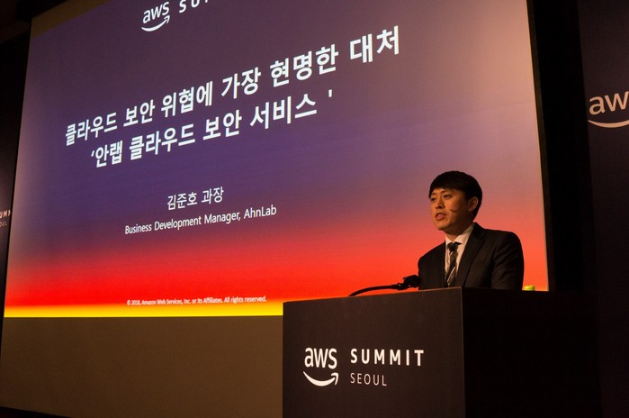 세션 발표에서는 안랩 서비스사업기획팀 김준호 과장이 ‘클라우드 보안 위협에 가장 현명한 대처, 안랩 클라우드 보안 서비스’를 주제로 클라우드 환경에서의 최신 보안위협 동향을 소개했다. 또, ‘아마존 웹 서비스(AWS) 고객을 위한 안랩 원격보안관제 서비스’의 실제 보안 위협 대응 사례와 전략을 소개해 참석자들의 호응을 얻었다.