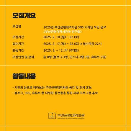 선발된 기자단은 오는 3월 발대식을 시작으로 12월까지 약 10개월간 부산근현대역사관 전시, 교육, 행사 프로그램 등 홍보 콘텐츠를 제작해 역사관을 널리 알리는 활동을 하게 된다.
