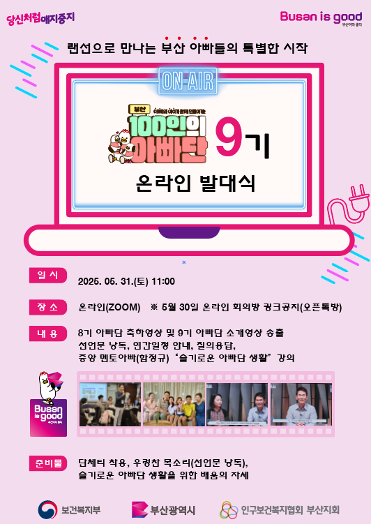 하반기에는 부산 내 육아 가정을 응원하고 함께 육아 분위기를 조성하기 위해 아이와 온 가족이 즐길 수 있는 시-구·군 아빠단 협동사업을 추진할 예정이다.