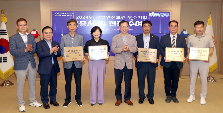 [광주 세계타임즈=손권일 기자] 광주광역시(강기정 시장)는 9일 시청 비즈니스룸에서 ‘2024년 광주시 산업안전보건 우수기업’ 5개 사에 인증서와 현판을 수여했다.