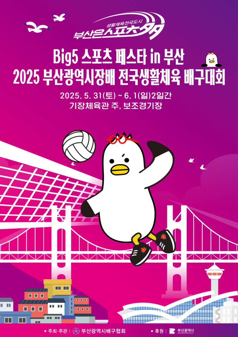 ◈ 5.31. 11:30 기장체육관 주경기장에서 부산 출신 인기 프로배구 선수 팬사인회도 개최 [부산 세계타임즈=이용우 기자] 부산시(시장 박형준)는 '5월 생활체육의 달'을 맞아 오는 내일(31일)부터 6월 1일까지 기장체육관에서 「빅(BIG)5 부산광역시장배 전국 생활체육 배구대회」를 개최한다고 밝혔다.