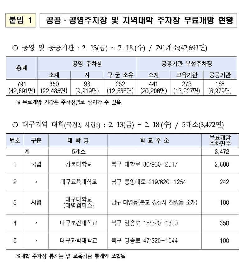 아울러 설 연휴 기간 시민들의 주차 편의와 지역상권 활성화를 위해 공영·공공주차장 791개소, 42,691면을 2월 13일부터 18일까지 무료로 개방한다. 무료개방 주차장 상세 정보는 대구시 홈페이지(공지사항)에서 확인할 수 있다. 또한 ‘대구시 통합주차정보시스템’을 통해 공영주차장 위치 정보와 실시간 주차공간 확인도 가능하다.